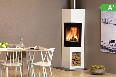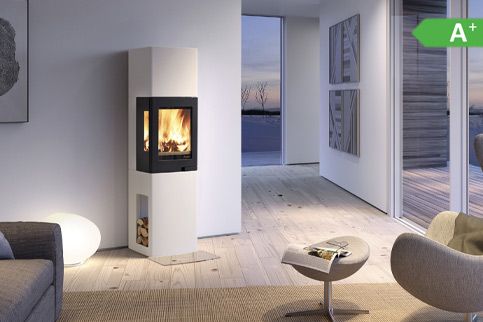 De haard is smal en neemt weinig vloeroppervlak in beslag.